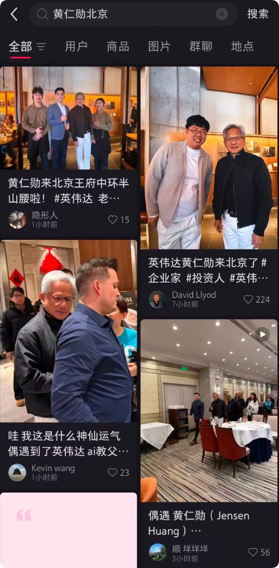 IT之家注意到,在结束上海首站行程后,今日有网友拍到黄仁勋现身北京,并于中午到访王府中环半山腰云南菜用餐。