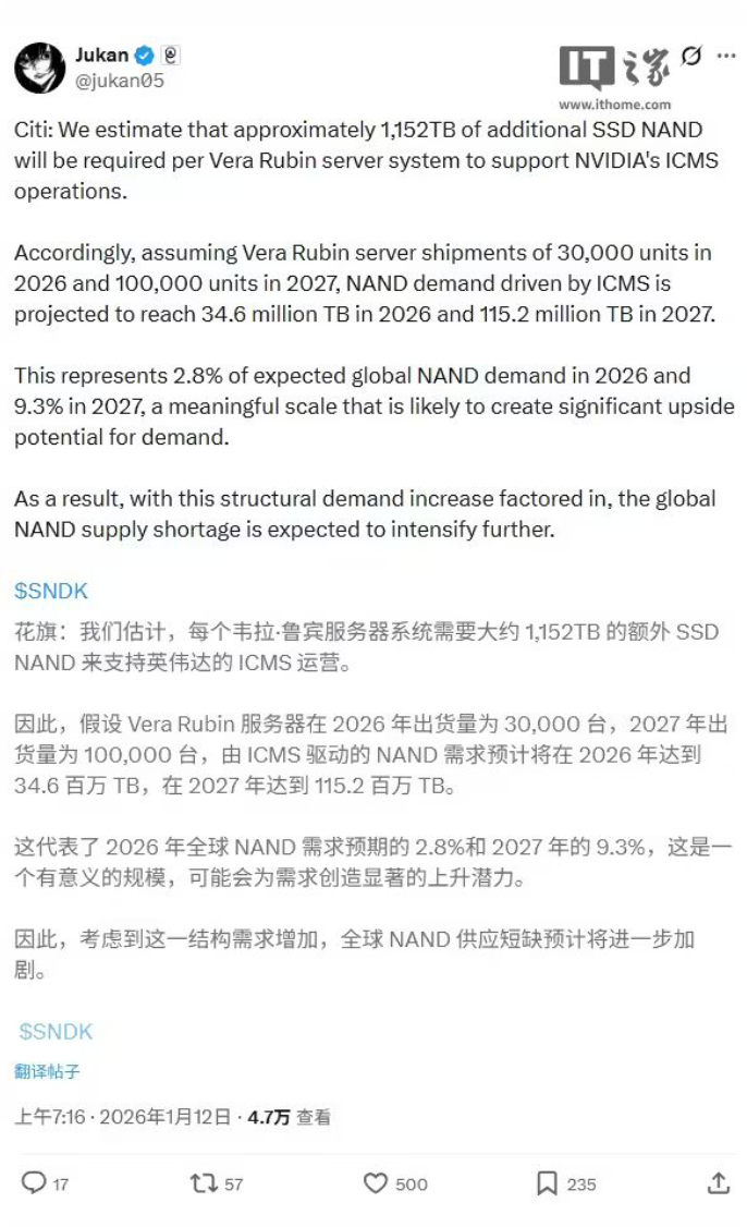 根据 @Jukan 获取到的最新花旗分析报告,英伟达下一代 Vera Rubin 架构的 AI 服务器未来几年内可能会对固态硬盘(SSD)和 NAND 闪存市场形成显著拉动,并进一步加剧当前已存在的供应紧张局面。