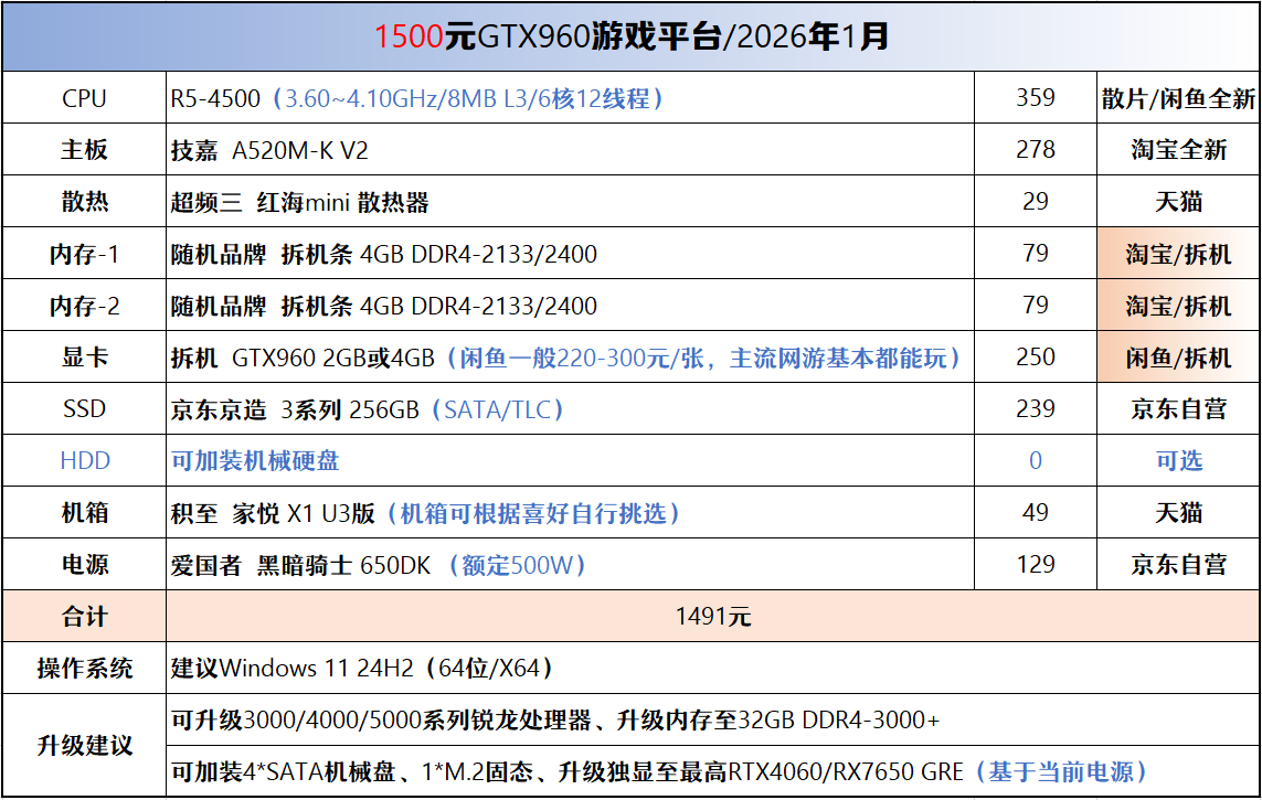 这套配置是一个入门级的游戏方案,GTX960性能类似于GTX1050Ti,基本上各大主流网游都能流畅运行,需求不是很高的大型单机也可以玩一玩。它有2GB、4GB两种显存可选,预算足够的情况下优先考虑4GB显存,预算较低的朋友可以选2GB,且公版造型的涡轮卡价格相对低廉,一般只要220-240元左右。主板你可以选择二手拆机板,价格可以便宜100元左右。
