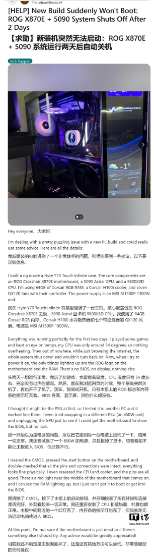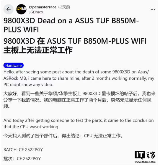 第三起案例则将风险范围扩大到了主流市场。用户 u/JGDraco 报告称,其搭载 ASUS TUF B850M-Plus WiFi 主板的电脑在稳定运行两个月后突然无法启动,经检查确认 Ryzen 7 9800X3D 已经损坏。