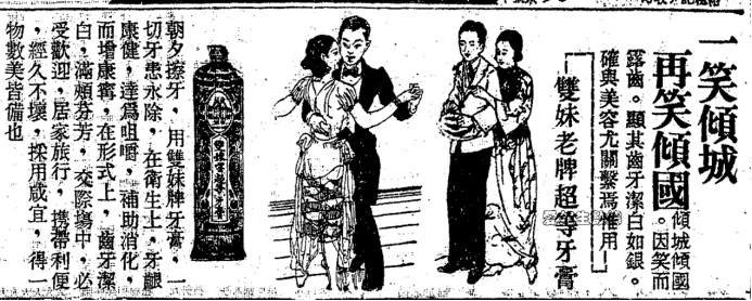 民国口腔卫生产品广告始终围绕笑容构建完整的消费欲望链条:先激发人们的微笑需求,如获得社交认可、身份认同,再指出笑容前提,即齿白、牙健,最后提供解决方案,推销产品。笔者将此种由笑容需求催生出的一系列商业活动称为“笑容经济”。