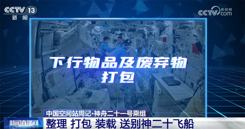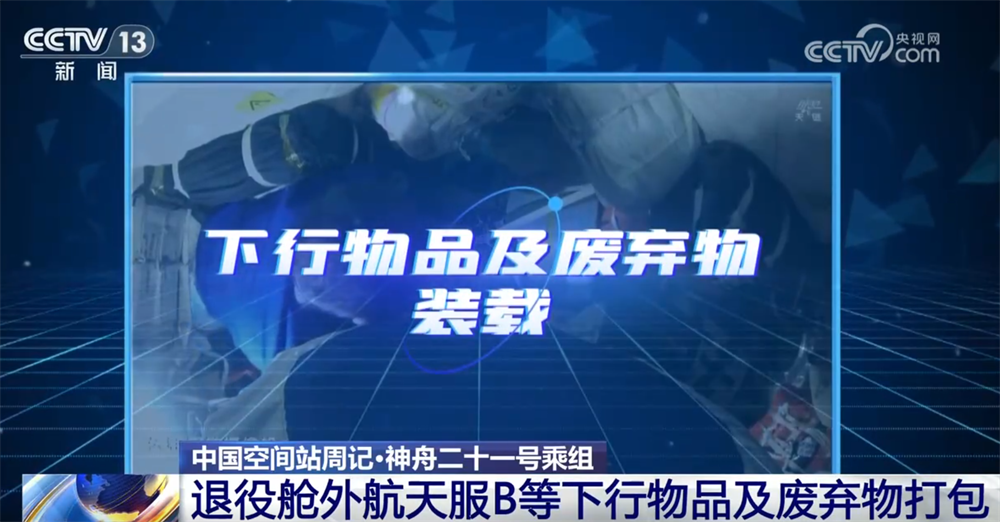 三名航天员系统整理、打包了下行物品及废弃物。其中,下行物品包括退役舱外航天服B、多个空间应用系统大型载荷等。