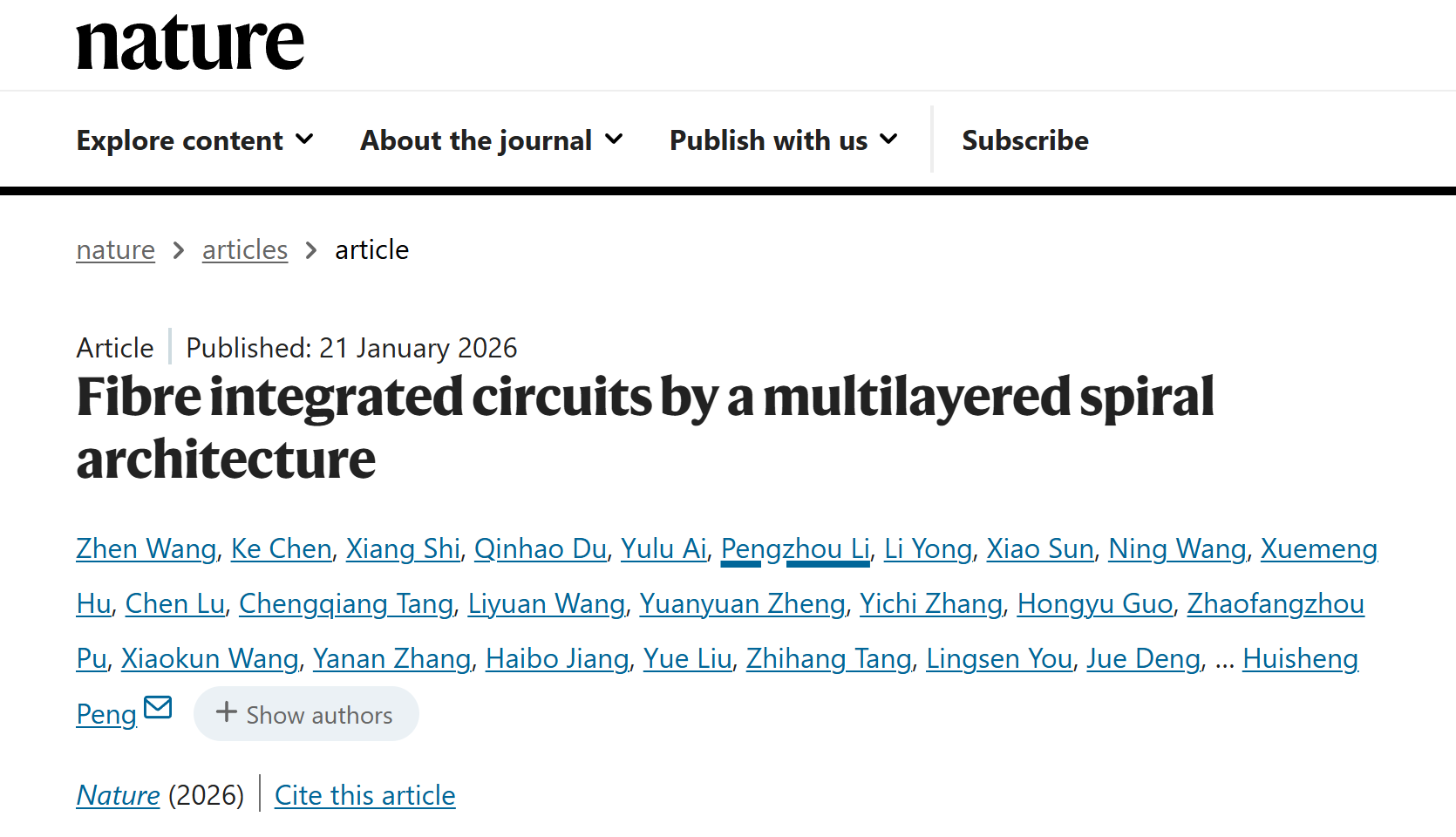 摘要:1月22日,记者从复旦大学获悉,一项可能改变未来穿衣体验的技术突破问世。该校彭慧胜/陈培宁团队成功制造出一种新型纤维,它不仅能弯曲、拉伸,更关键的是内部含有高密度的微型电路,具备良好的信息处理能力。该成果于1月22日凌晨以《基于多层旋叠架构的纤维集成电路》为题发表于《自然》主刊上,意味着未来我们的衣服本身可能就会“思考”和“计算”。
