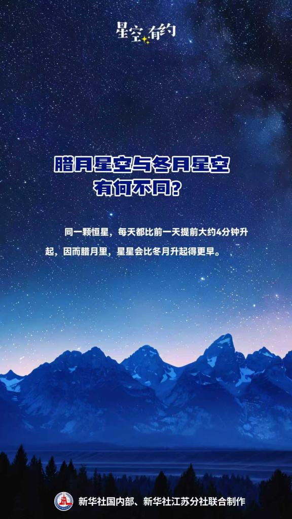 今年1月下旬,正值农历腊月(农历十二月)。农历腊月与冬月(农历十一月)的星空有区别吗?王科超解释说,同一颗恒星,每天都比前一天提前大约4分钟升起,因而腊月里,星星会比冬月升起得更早。例如,今年1月下旬晚8点,天狼星已从东方升起,在地平线上约20度的位置,而2025年12月下旬晚8点,天狼星则刚从地平线升起。
