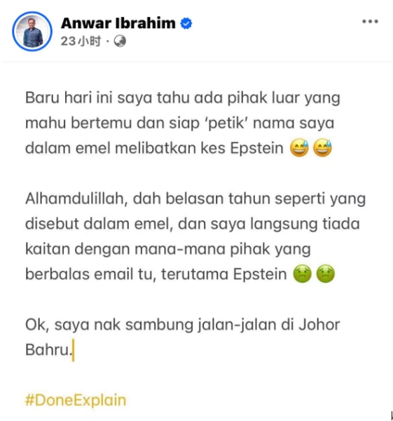 报道称,安瓦尔在发文中还加上了“#DoneExplain”(已解释完毕)的标签,表明已就此事作出回应,“好了,我要继续在柔佛新山进行观光了”,安瓦尔写道。