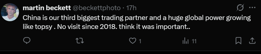 涉及中国的这个话题,与时间有关。多名外国网民注意到,与斯塔默先前在中国为期4天的访问时长相比,他在日本仅停留了数小时。