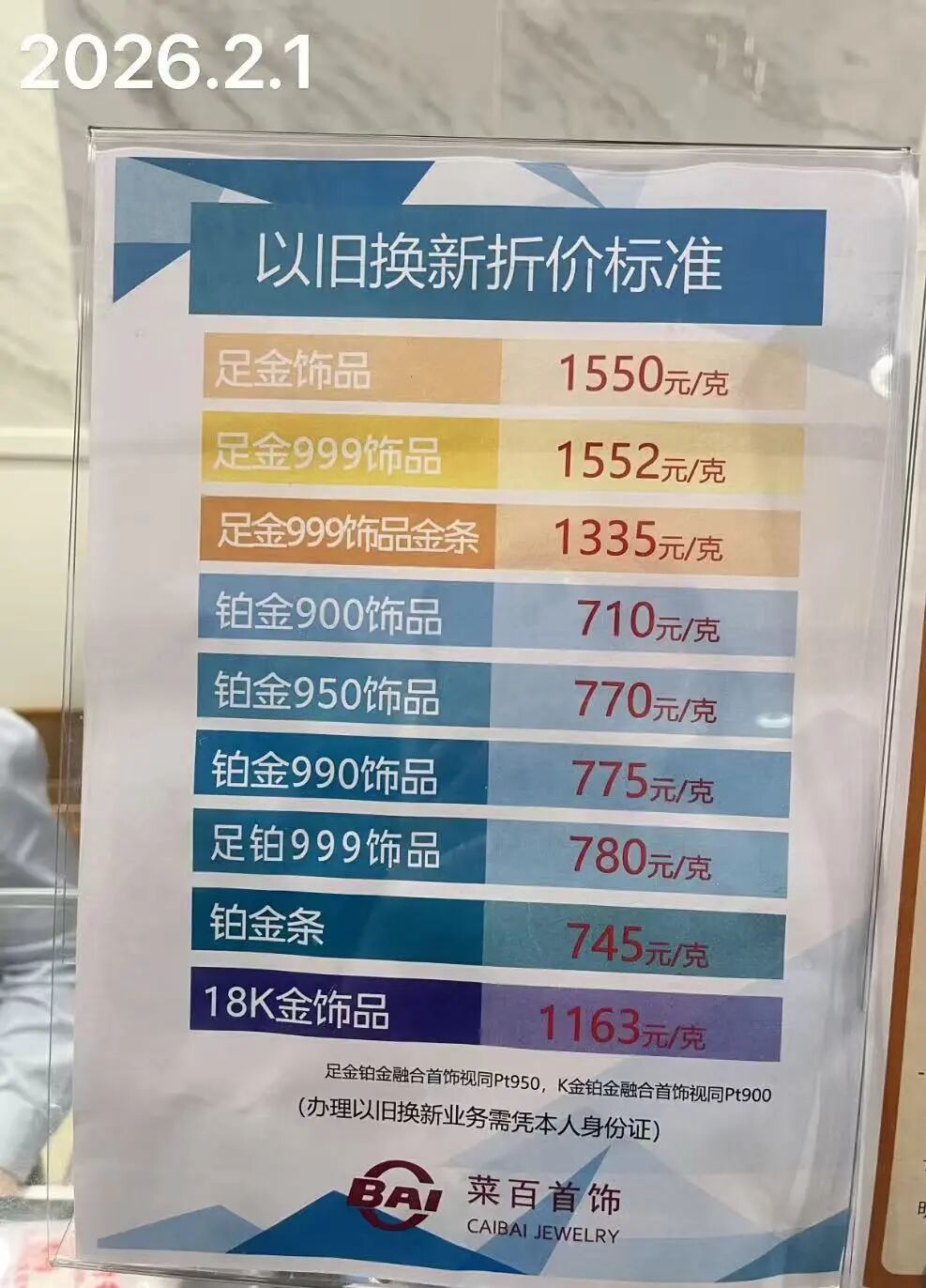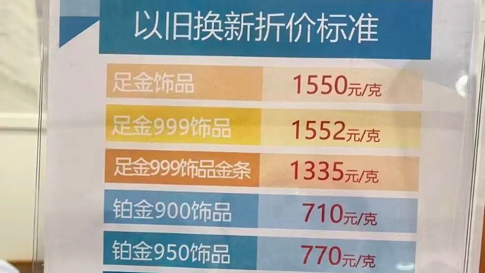 菜百一楼金饰品区域买金,一位女士正在办理以旧换新业务,她看中了一条标价8000多元的金项链,最终以低于市场价格25元/克的折旧价格完成置换。在显眼的公告牌上,菜百当日金价清晰标注为1550元/克。