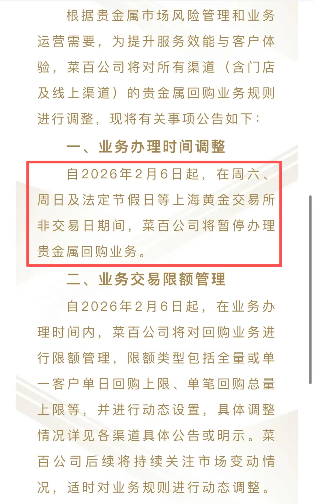 据“菜百首饰”微信公众号2月2日晚最新消息,2月6日起,周末及节假日,菜百将暂停贵金属回购业务。