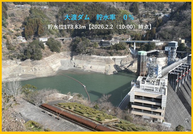 【环球网报道】综合日本广播协会(NHK)等日媒报道,近日,日本关东、九州等部分地区遭遇三十年一遇的干旱少雨天气。日本国土交通省近日发出警告,称多个主要水库水位告急,呼吁民众进一步节约用水。据报道,国土交通省大渡水库管理局2月2日在社交媒体上发文称,大渡水库遭遇大坝建成以来前所未有干涸,蓄水率于1月31日降至0%。管理局还发出2025年11月11日和2026年2月2日的对比图片,可以看到水位明显下降,部分河床露出水面。位于高知县的大渡水库是日本四国地区的主要水库。日媒援引国土交通省的消息称,除大渡水库外,爱媛县的鹿野川水库、奈良县的大滝水库等也发生严重干涸。另据日媒此前报道,东京都水道局于1月26日在其官网上发布声明,敦促居民节约用水。声明指出,为东京供水的小河内水库(奥多摩湖)当前储水量大幅低于常年水平,已突破平成(1989年)以来的最低水位。NHK称,日本国土交通省已在多地采取降压供水等措施应对水库干涸,同时呼吁日本民众进一步节约用水。日本气象厅预测,关东、九州等部分地区遭遇的干旱仍将持续,预计未来一个月内不会有明显降水。
