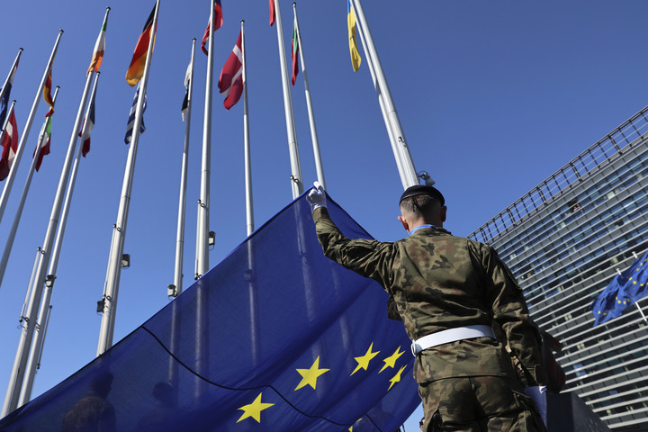 一名士兵手持欧盟旗帜(美联社资料图片)