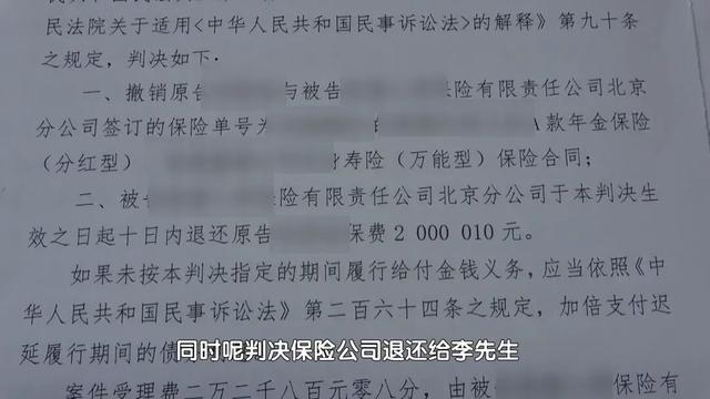 同时,法院认定李先生起诉时,并未超过《民法典》规定的一年撤销权除斥期间。综合全案证据,密云法院最终作出判决:认定保险公司行为构成欺诈,支持原告的诉讼请求,撤销保险合同,同时判决保险公司退还李先生2000010元的保险费。