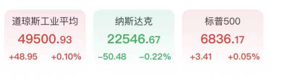 周五美股涨跌互现,通胀数据降温支撑了市场对美联储降息的预期,科技股仍然面临AI 相关担忧引发的剧烈波动。截至收盘,道指涨48.95点,涨幅0.10%,报49500.93点,纳指跌0.22%,报22546.67点,标普500指数涨0.05%,报6836.17点。