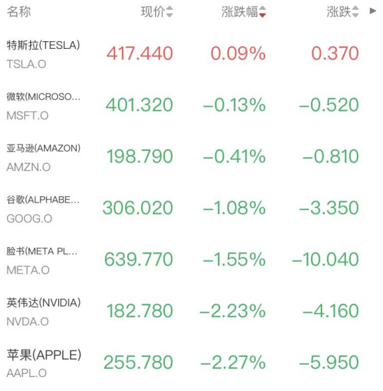 明星科技股跌多涨少。特斯拉涨0.09%,微软跌0.13%,亚马逊跌0.41%,日线九连阴创近20年最差纪录,谷歌,Meta跌超1%,英伟达、苹果跌超2%。