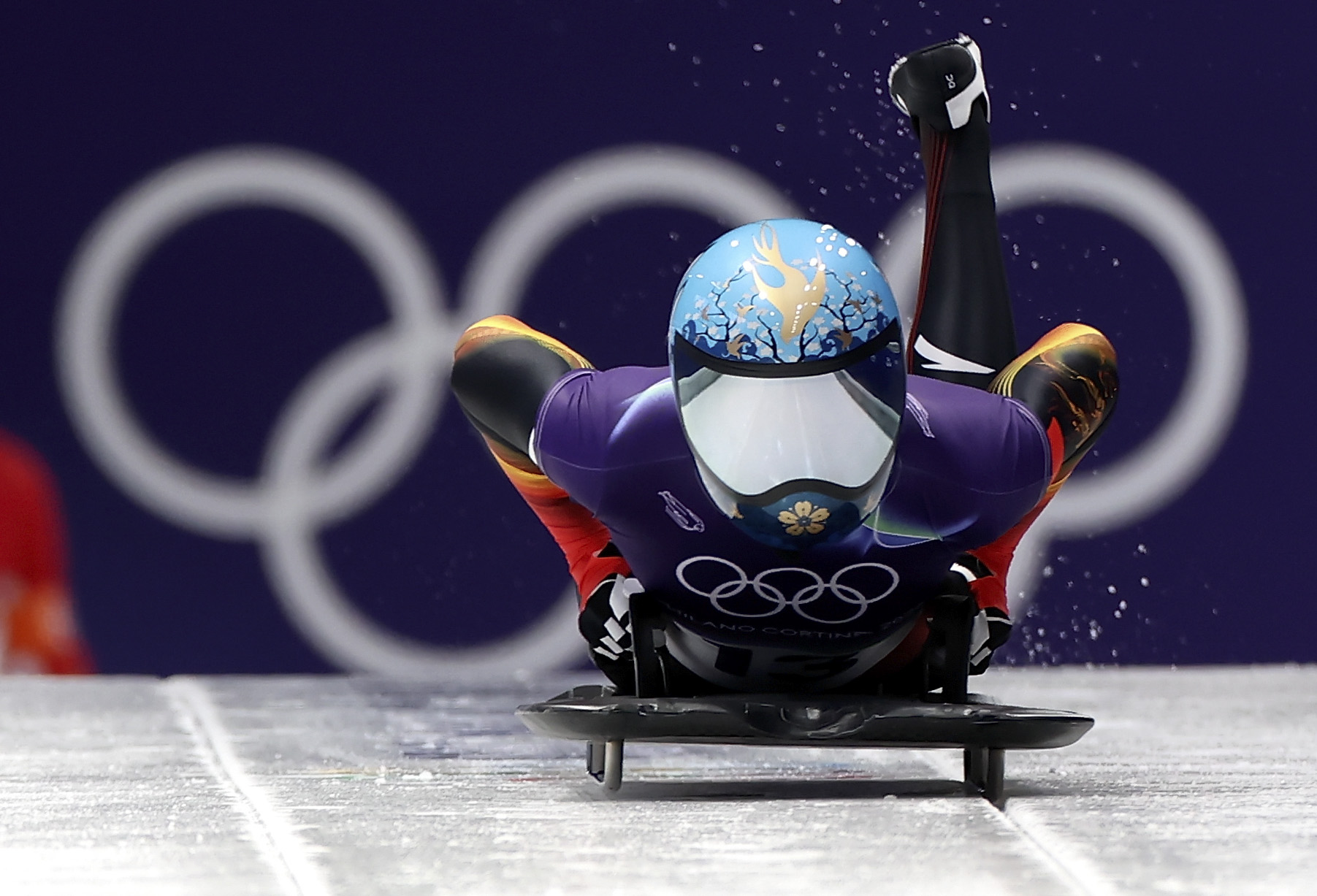 2月13日,中国选手赵丹在钢架雪车女子单人赛第一轮比赛中出发。新华社记者 丁旭 摄