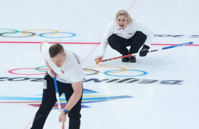 2月7日,挪威队选手斯卡斯利恩(后)和内德雷戈滕在米兰冬奥会冰壶混双比赛中。新华社记者 王婧嫱 摄