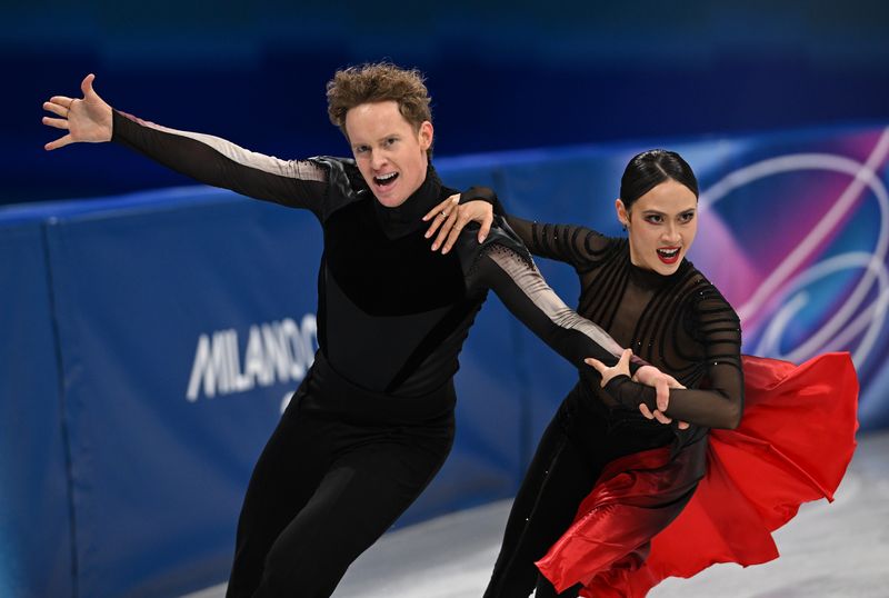 2月11日,美国组合乔克(右)/贝茨在米兰冬奥会花样滑冰项目比赛中。他们获得冰舞亚军。 新华社记者 程敏 摄