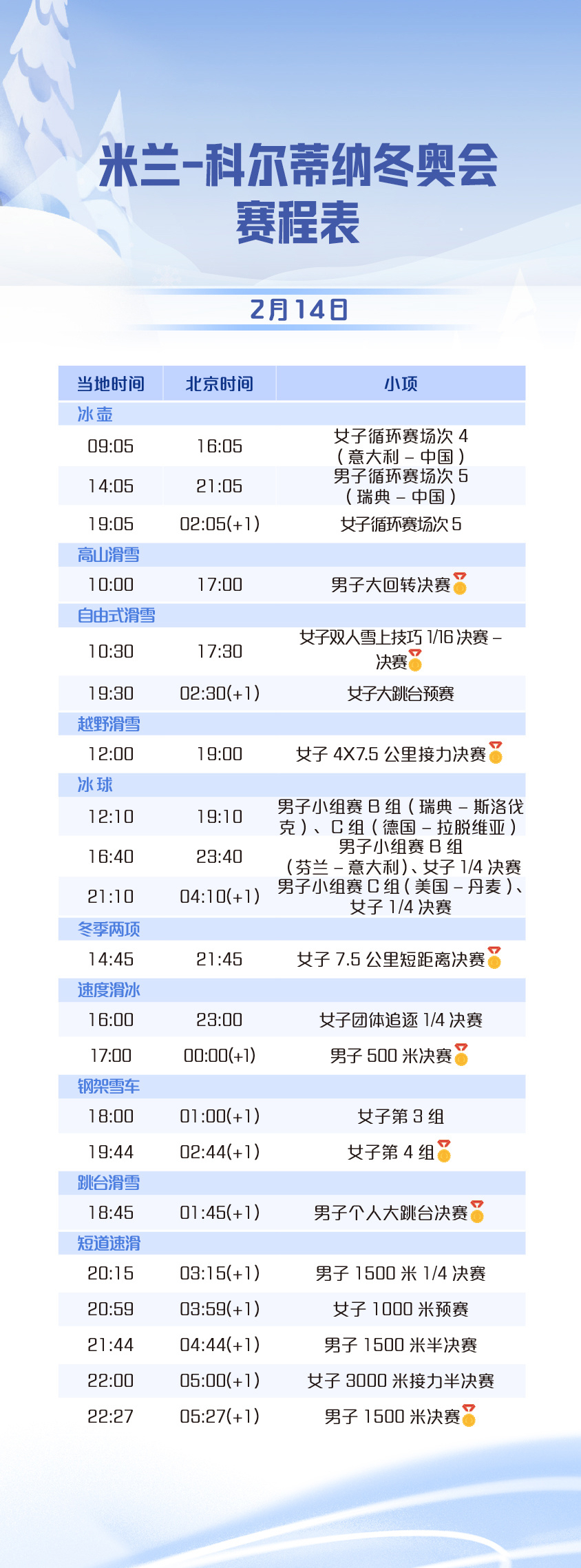 米兰冬奥会今天将产生8枚金牌,北京冬奥会冠军高亭宇将登场,出战速度滑冰男子500米决赛,谷爱凌也将再次亮相,参加自由式滑雪女子大跳台预赛。