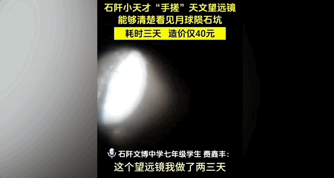 有学生用镜片、目镜、寻星镜,纸壳、木棍和胶带,“手搓”一台能清晰观察月球表面细节的简易望远镜,耗时三天,造价仅40元;