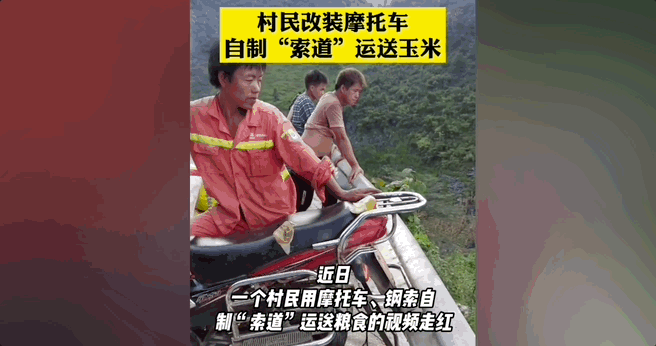 贵州一位大叔,用钢丝绳、木板和一台旧发动机,硬是整出了一条“山地索道”,用于水果运输。
