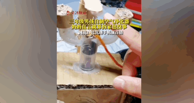 有孩子把电路板、木板纸、塑料瓶重新组合,自制空气净化器;