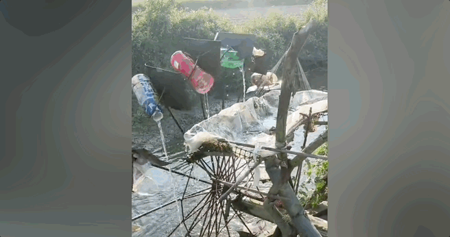 听起来不起眼的“驱鸟装置”,农村几乎家家都研究过:有人挂起成串的反光片;有人在田间挂起一根木条,上面系着一个易拉罐,易拉罐里装着一个钢珠,风一吹叮咚响;有人把旧 CD 吊在绳子上;有人干脆自制水力驱鸟,一转起来,声音哐哐哐。