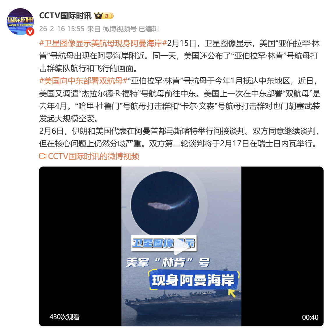 2月15日,卫星图像显示,美国“亚伯拉罕·林肯”号航母出现在阿曼海岸附近。同一天,美国还公布了“亚伯拉罕·林肯”号航母打击群编队航行和飞行的画面。“亚伯拉罕·林肯”号航母于今年1月抵达中东地区,近日,美国又调遣“杰拉尔德·R·福特”号航母前往中东。美国上一次在中东部署“双航母”是去年4月。“哈里·杜鲁门”号航母打击群和“卡尔·文森”号航母打击群对也门胡塞武装发起大规模空袭。 2月6日,伊朗和美国代表在阿曼首都马斯喀特举行间接谈判。双方同意继续谈判,但在核心问题上仍然分歧严重。双方第二轮谈判将于2月17日在瑞士日内瓦举行。