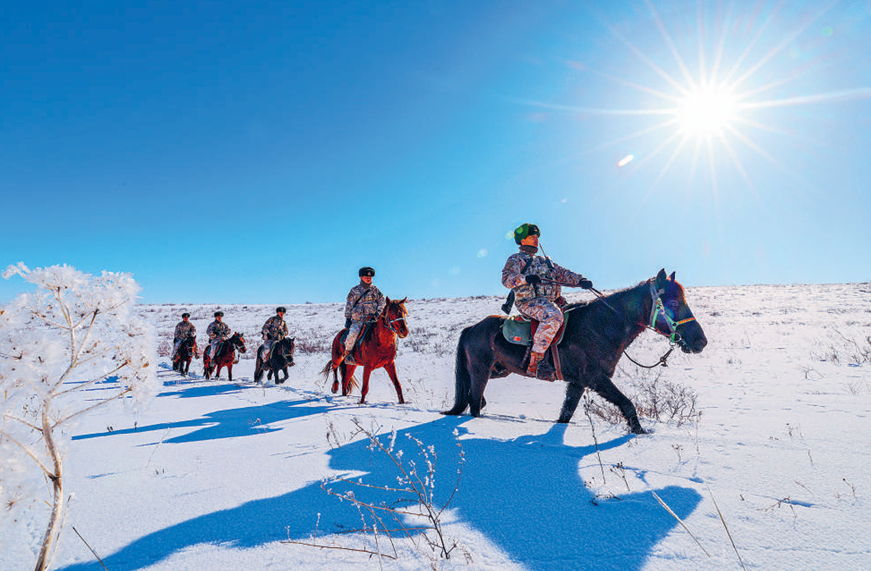 春节前夕,记者走访多支部队,感受戍边官兵的忠诚与担当——头顶边关冷月 守护万家灯火■解放军报记者 王 越近日,新疆军区某边防连官兵骑马执行巡逻任务。付 洋摄春节前夕,南沙夜晚,海风轻拂,一座礁盘犹如新月静卧海面。海军南沙渚碧礁守备部队营区内歌声嘹亮,二级上士武娇娇正和战友们一同排练歌曲《边关的月》。排练结束,已是深夜,武娇娇迅速整理装具,快步走向值班岗位。清冷的月光与营区火红的灯笼交相辉映,将她的影子拉得很长。 “南沙的月亮,最懂坚守的分量。”作为通信兵,武娇娇的战位在机房的设备与线缆之间。此刻的她更加懂得,守岛就是守国,国安才能家安,边关冷月下的战位执勤,是为了让更多家庭能在灯火里安稳守岁。万家团圆时,将士备战忙。对军人来说,春节的意义,更在于“为祖国站岗,为人民守岁”的坚守。这份坚守,遍布万里边关和座座军营——大漠戈壁,朔风如刀。驻地洋溢着融融暖意和浓浓年味,西部战区空军某雷达站内,荧屏闪烁。官兵全神贯注、紧盯空情态势,擦亮守卫祖国空天的“千里眼”。“越是重大节日,越要全时戒备,决不能漏掉一个空情!”荧屏前,二级上士覃洋沙目不转睛,对各类数据信息进行分析研判。风沙暂停,月光洒满无垠大漠。值守间隙,该站仇指导员望向远方,语气坚定而自豪:“空天安全,使命如山。我们扎根大漠,用忠诚守护祖国安宁,时刻在岗、全时待战!”羌塘腹地,一场暴雪突至,新藏线某路段积雪严重,百余名返乡群众被困。接上级命令,武警第二机动总队某支队迅速启动应急抢险救援预案,一级上士龙胜海驾驶头车,顶风冒雪驶向一线。破冰机凿开冰层、抛雪机清理积雪、除雪车与融雪剂撒布车梯次作业……不到2个小时,官兵就开辟出一条生命通道。“这个春节,高原风雪依旧,但我们坚守‘天路’的信念永远不变。”雪停风续,云散月出。任务归途,龙胜海的话语穿透寒风:“为了万家团圆,我们时刻准备着。”“守山河无恙,护岁月静好!”执行武装巡逻任务的西藏军区“墨脱戍边模范营”某连官兵,叫响满怀赤诚的豪迈誓言,向海拔3800米的某哨点挺进。记者一路跟随,当顺利踏上哨点顶端,万家灯火尽收眼底:山下,美丽的县城火树银花、霓虹闪烁,车水马龙;天边,一轮明月悄然探出云端,映照出大地的轮廓。巡逻结束,官兵返回营区休整,月光映照着一张张年轻的脸庞。记者问列兵李应国:“想家吗?”李应国点点头,但随即说道:“心之所安,便是故乡。我们守护的万家灯火里,也有一盏是我的家。”头顶边关月,脚踏边防线。此刻,记者深切感受到,这群年轻官兵的青春和热血,早已和边防线融为一体,化为守护祖国和人民和平安宁的钢铁长城。又是一年新春佳节,广大戍边官兵坚守战位,把“边防有我,请祖国和人民放心”的铮铮誓言,写在祖国大地的万里山河!