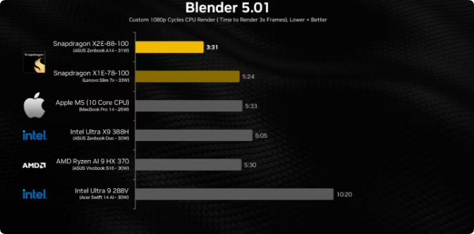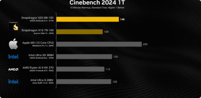 2 月 9 日消息,高通去年已推出骁龙 X2 Elite Extreme 与骁龙 X2 Elite 处理器,其中定位稍低的这款 SoC 已在一系列 CPU、GPU 基准测试中经受了考验。测试结果令人意外:在部分项目中,高通骁龙 X2 Elite 不仅大幅领先其上一代产品,甚至在部分场景下超越了苹果的 M5。