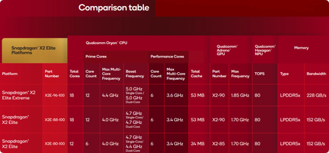 去年在2025年骁龙峰会上,高通宣布推出骁龙X2 Elite系列处理器,分为骁龙X2 Elite Extreme和骁龙X2 Elite两款产品。其中骁龙X2 Elite Extreme专为超高端Windows 11 PC打造,提供了最多18个核心,最高频率可达5GHz(最多2个核心),是系列产品中唯一采用统一内存架构的型号,标配48GB的LPDDR5X内存,拥有12通道及高达228GB/s带宽。