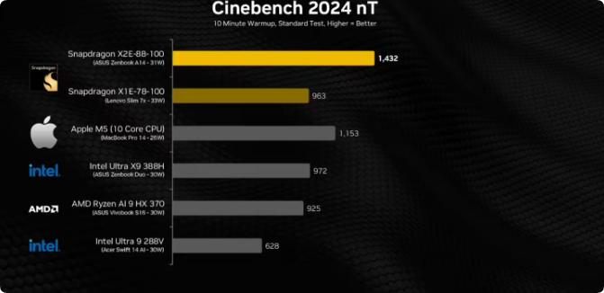 骁龙 X2 Elite - 1432(比 M5 快 24.2%,比骁龙 X Elite 快 48.7%)