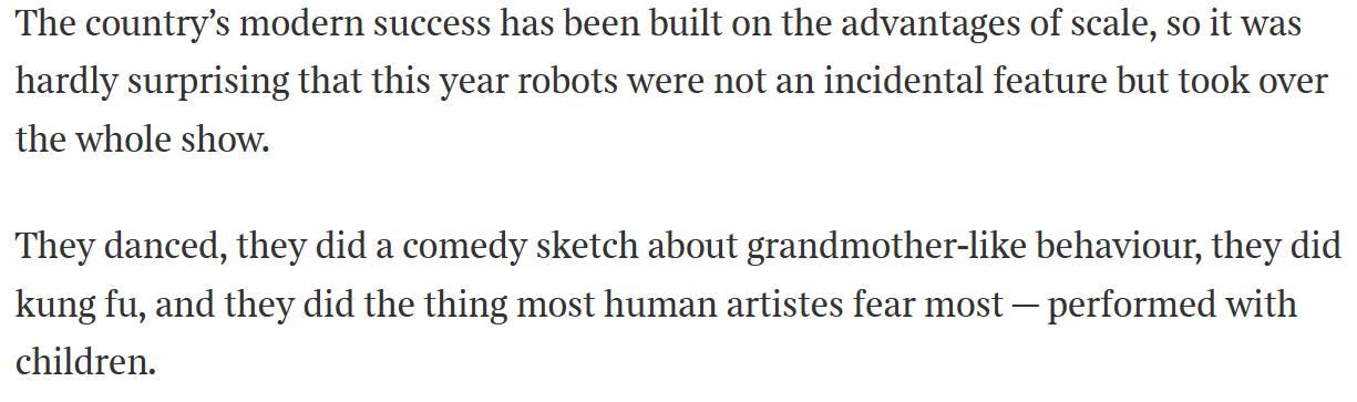 英国《泰晤士报》报道,机器人在今年总台春晚舞台上不仅是一个“附带的特色项目”,而是成为整台晚会的一大主题。在这场盛会上由机器人参演多个节目,特别是允许机器人与孩子们一同出演节目,展现了中国对国产机器人技术的自信。