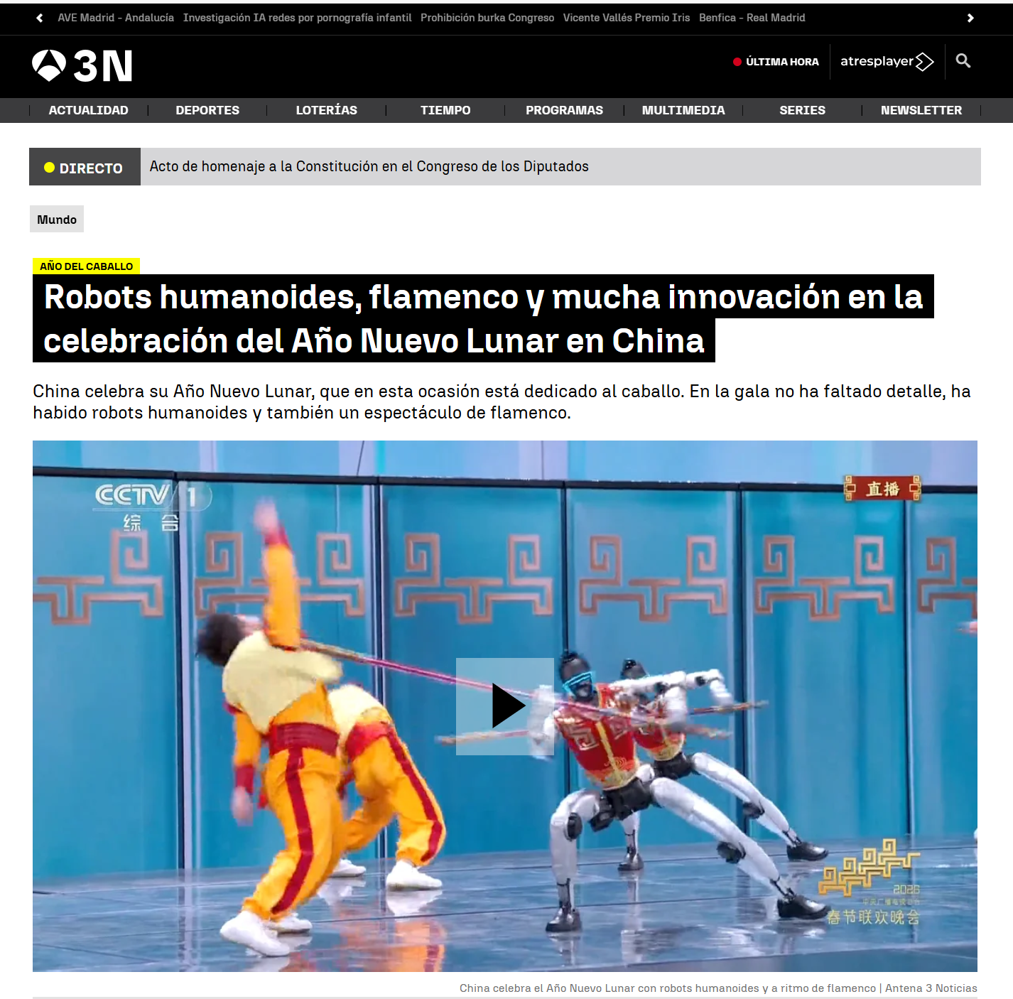 西班牙著名电视台ATENA3官网发布报道称,在中国晚会上,人与机器的表演得到充分展现,舞台上的人形机器人能够完成特技跳跃、连续空翻以及与人类艺术家协同的群体动作。
