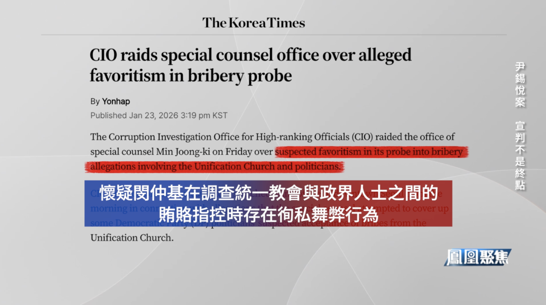 闵中基遇到的麻烦这回完了吗?还没完!按照韩国法律,三大特检组的调查在2025年12月已全部结束。但2026年1月23日,闵中基因涉嫌徇私舞弊,其办公室被韩国高官贪污调查室搜查,他们怀疑闵中基在调查统一教会和政界人士受贿指控的过程中存在徇私舞弊行为,而这比金建希案一审宣判还早了三天。