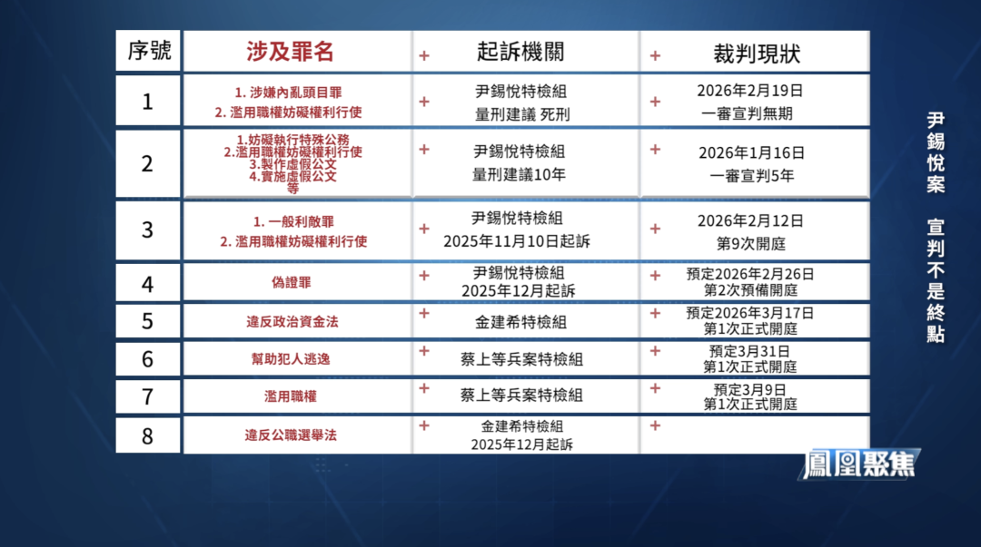 上图为尹锡悦面临的8项刑事指控,由于罪名涉及不同法律领域和时间段,这些指控并未合并审理,而是采用分案审判的模式,其审判进度和量刑严重程度也不相同。