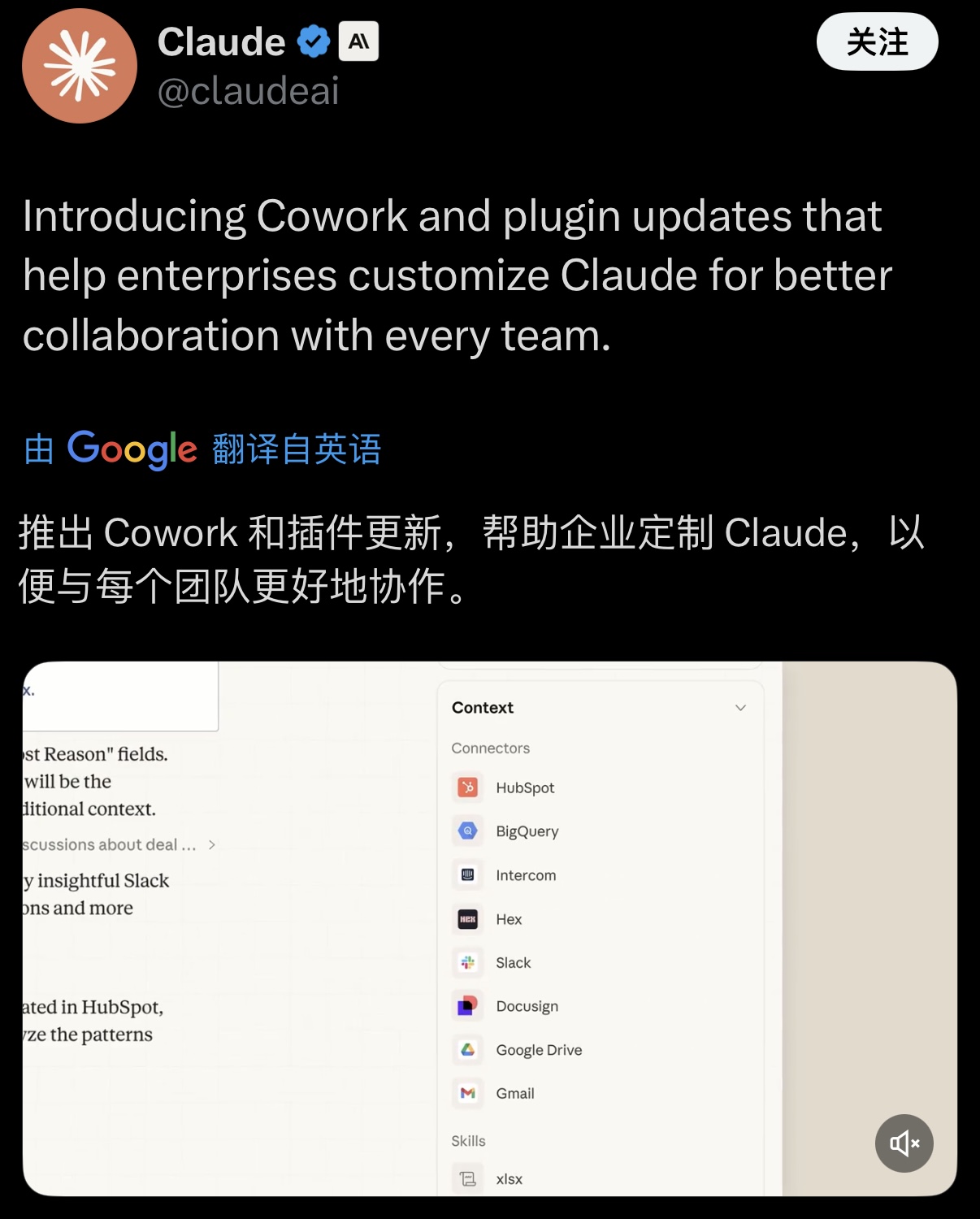 Anthropic的企业产品主管斯科特·怀特(Scott White)表示,最新一批加入Claude Coworks的10个插件中有一半与资本市场有关,这些插件能够提升Claude在特定任务中的表现,例如私募股权工作中的建模、为设计相关工作整理创意概要,以及为运营相关任务总结供应商提案等。