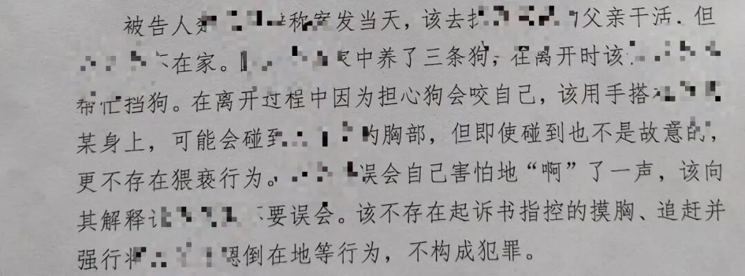楚某庭上辩称,因为兰兰家养了三条狗,在离开时他让兰兰帮忙挡狗,可能会碰到兰兰的胸部,但即使碰到也不是故意的,更不存在猥亵行为。不存在被指控的摸胸、追赶并强行将兰兰摁倒在地等行为,不构成犯罪。