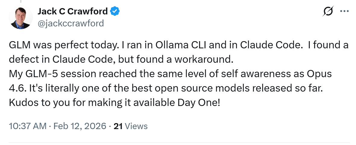 另一位开发者则称,GLM-5表现得很完美,绝对是目前发布的最优秀开源模型之一。“我在 Ollama 命令行和 Claude Code 里都跑了一遍。我发现 Claude Code 里有个缺陷,但找到了临时解决办法。我的 GLM-5 对话会话达到了和 Opus 4.6 同一水准的自我认知 / 理解深度。”
