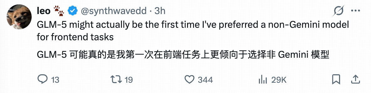 还有开发者评价道,“GLM-5可能真的是我第一次在前端任务上更倾向于选择非Gemini模型。”