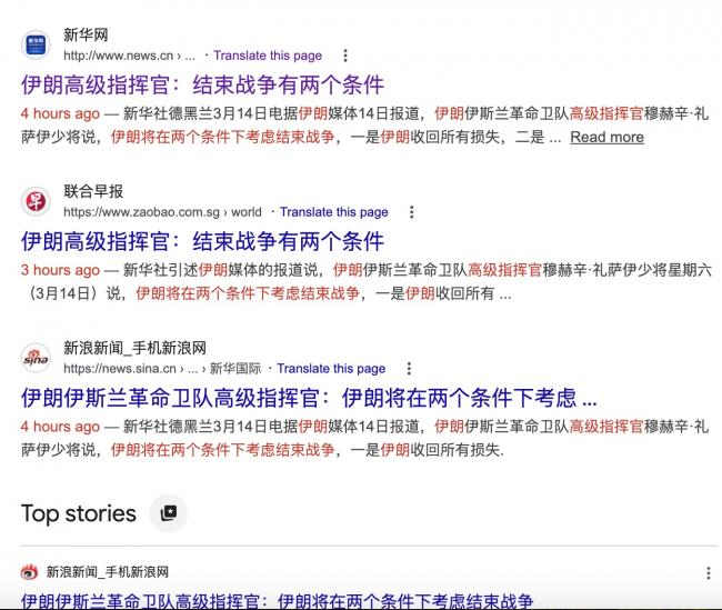 3月10日,中国一些媒体和自媒体还称:“战胜国要价:伊朗开出史无前例的停火6条”,包括所谓的“解除所有不公正的制裁”、“承认伊朗在其领土上进行铀浓缩的权利”、“赔偿因这场强加的战争造成的损失”等等。