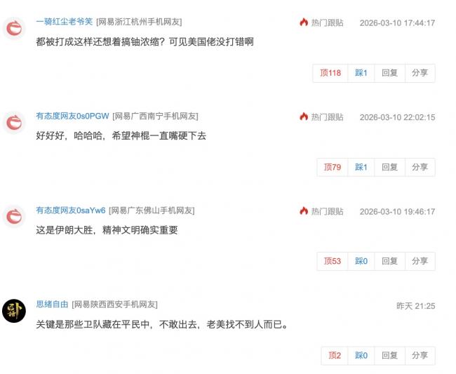 这些明显黑白颠倒的谎言惹大陆网友一片嘲讽:“都被打成这样还想著搞铀浓缩?可见美国佬没打错啊”“好好好,哈哈哈,希望神棍一直嘴硬下去”“这是伊朗大胜,精神文明确实重要”“笑死我了,做梦呢?”“假酒喝多了吧”“我加一条:要求解散现任美国和以色列政府”“炸成猪头了,大皇被毙,海空军基本全灭。还战胜国呢”“看国内媒体的报道,感觉是伊朗在吊打美以”“我长这么大没见过被打趴在地上还提停手条件的”。