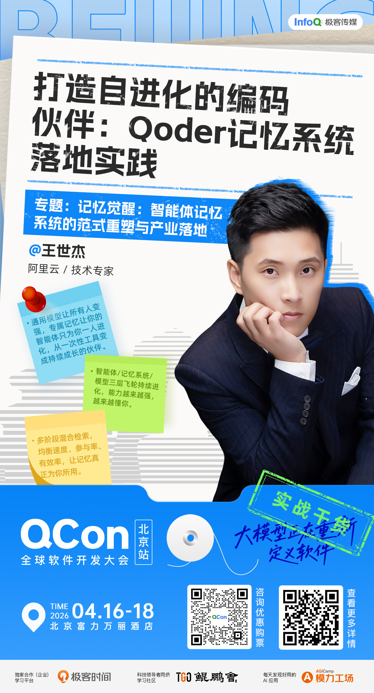 摘要:4月16日-4月18日,QCon 全球软件开发大会"将在北京举办。阿里云技术专家王世杰已确认出席 “记忆觉醒:智能体记忆系统的范式重塑与产业落地"” 专题,并发表题为《打造自进化的编码伙伴:Qoder 记忆系统落地实践"》的主题分享。曾就职于网易、蚂蚁、阿里云,有丰富的产品和平台开发经验,涉及电商、保险、交通等多个行业。