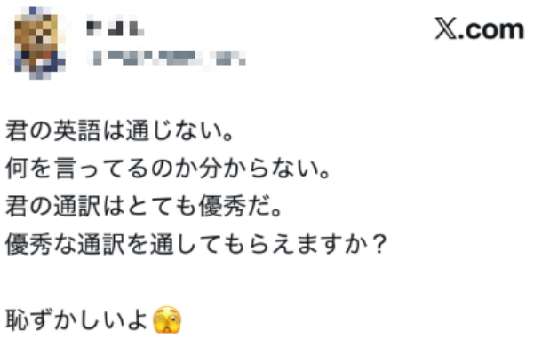 这一幕在日本网络上引发嘲笑,有日本网民说,“(特朗普的言下之意是)听不懂你的英语,不知道你在说什么,你的翻译很优秀,所以能不能通过优秀的翻译交流?这太丢人了。”