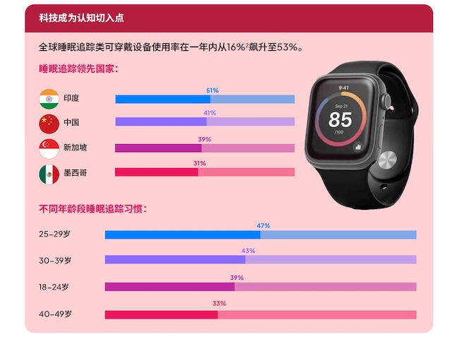 其中,印度、中国、新加坡、墨西哥是睡眠追踪领先国家,中国受访者中使用可穿戴设备监测睡眠的比例达到41%,仅次于印度,后者是51%。