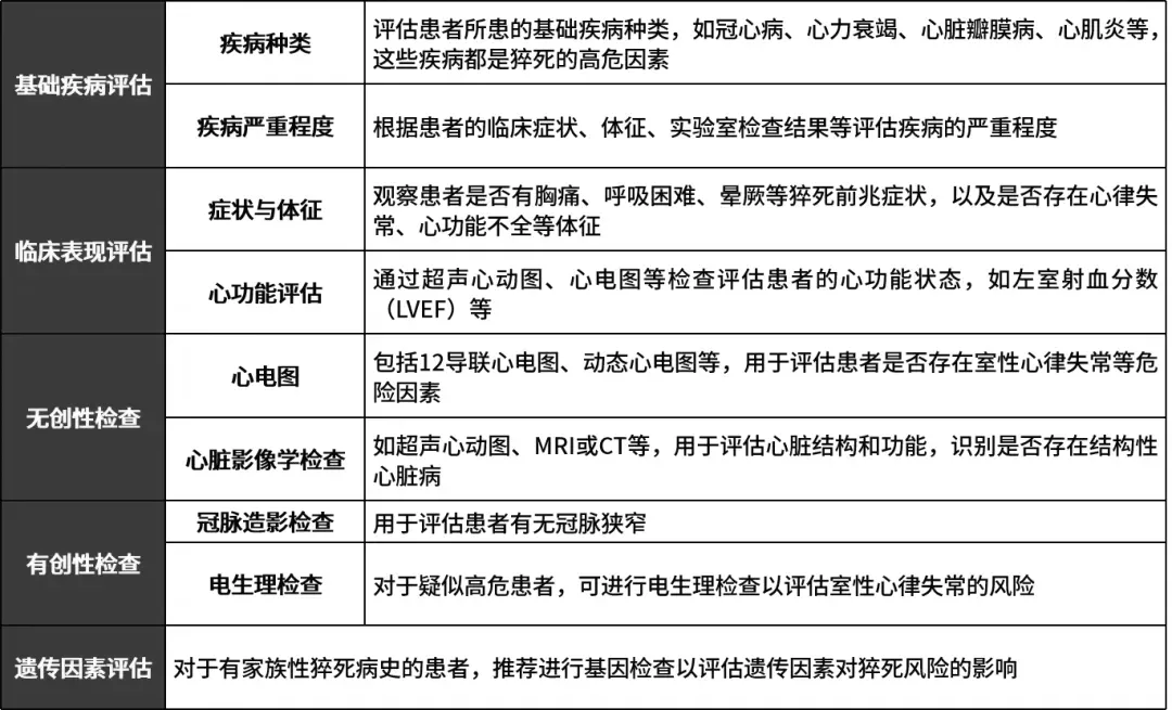 临床医生对有基础疾病的猝死患者进行风险分层和抢救是一个复杂而重要的过程,涉及多个方面。风险分层是评估患者发生猝死风险的重要步骤,有助于临床医生制定个性化的预防和治疗策略。对于有基础疾病的患者,风险分层主要基于以下几个方面,详见表2。