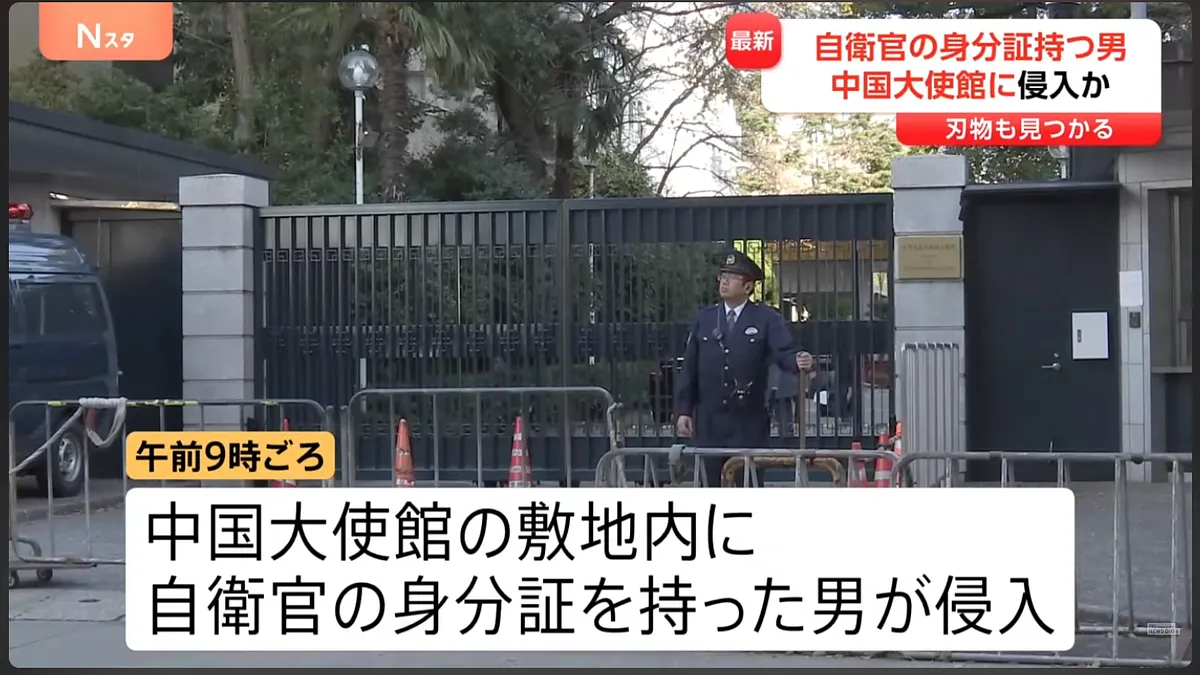 24日上午,日本警视厅透露,大约在上午9时左右,中国驻东京大使馆的职员在馆内发现,一名手持自卫官证件的陌生男子,随即通报日本警视厅协助抓人。快速赶往现场的警察,随后与使馆合作下,很快就控制住该名陌生男子。