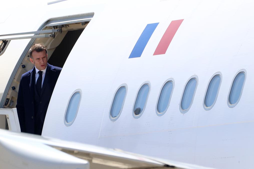 3月9日,法国总统马克龙抵达塞浦路斯西南部的帕潘德里欧空军基地。新华社发(乔治·克里斯托弗鲁摄)