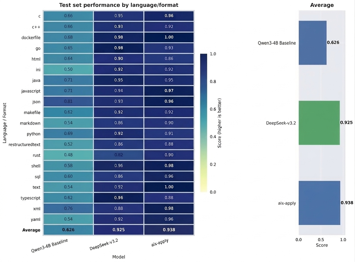 在准确率方面,测试结果显示,在覆盖20余种编程语言及文件类型的 1600 余条测试集上,aiX-apply表现优于同量级模型Qwen3-4B(准确率62.6%),更与参数规模相差一百多倍的 DeepSeek-V3.2(准确率92.5%)比肩。