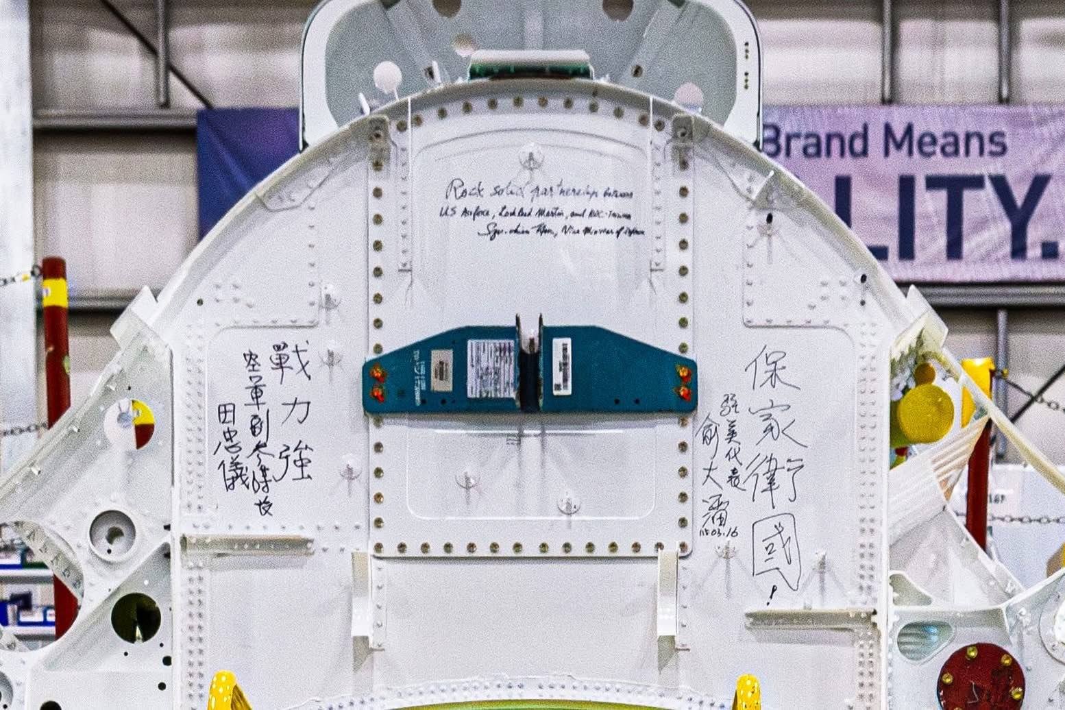 國防部官員日前率團,赴美國南卡羅萊納州的生產線,視察我國訂購的F-16 BLK70戰機,除見證由洛克希德馬丁公司完成驗收飛行測試(Acceptance Check Flight)的首架機。我方人員還分別在組裝機件寫下「戰力強」、「保家衛國」以及台美「堅若磐石夥伴關係」等中英文字樣。