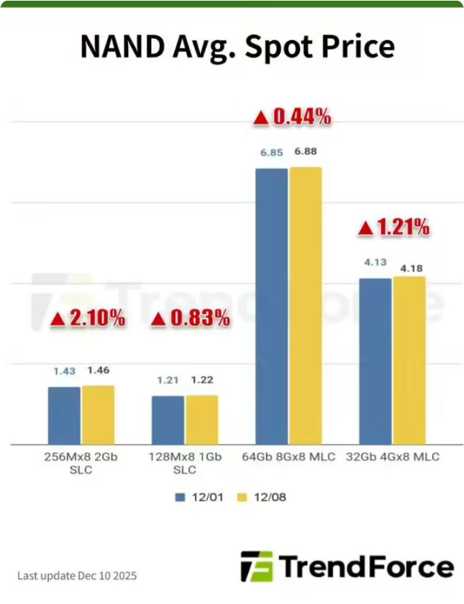 DDR5 与 DDR3 在前期大幅上涨后本周出现小幅回落,而 DDR4 尤其是 16Gb 产品,涨势依旧强劲。与此同时,NAND Flash 现货市场则在供应端的支撑下持续刷新历史高点,尽管涨幅较此前有所放缓。