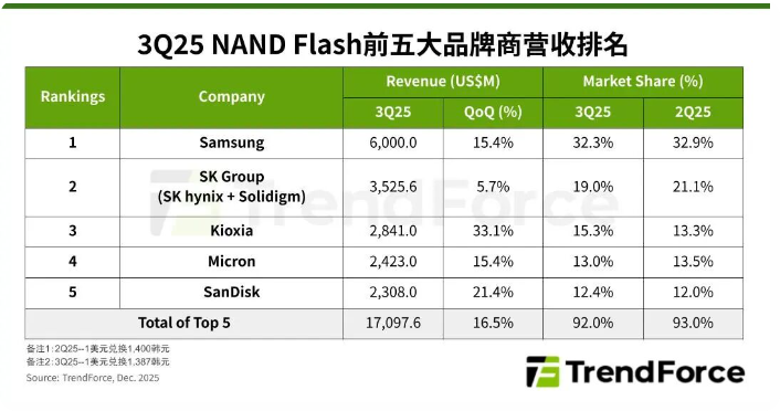新闻一:2025Q3前五大NAND闪存厂合计营收季增16.5%,AI基础建设推动增长